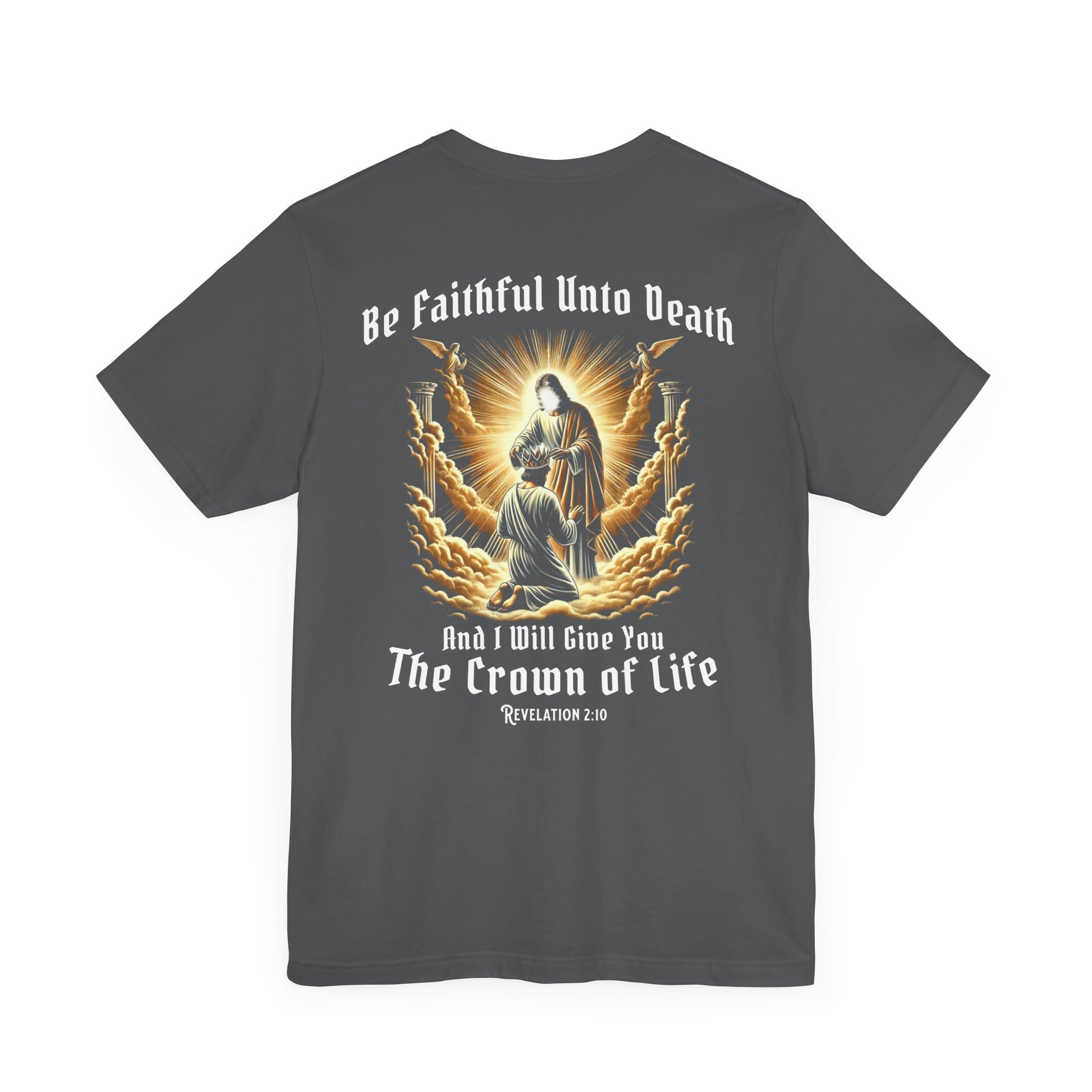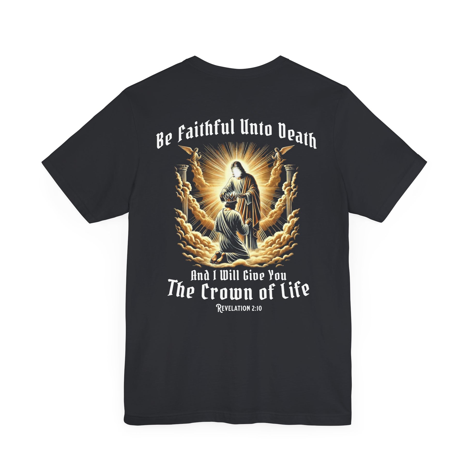 Embrace a higher calling with the "Crown of Life" graphic tee. Crafted from premium 100% Airlume combed and ring-spun cotton, this shirt combines comfort with a compelling message. The artwork portrays a saint in heaven receiving the crown of life, emphasizing the love for God and His kingdom above earthly pursuits. It's more than a shirt it's a statement of faith that invites conversations about the eternal hope we have in Jesus. Wear it boldly to reflect your devotion and inspire others to seek what truly matters.